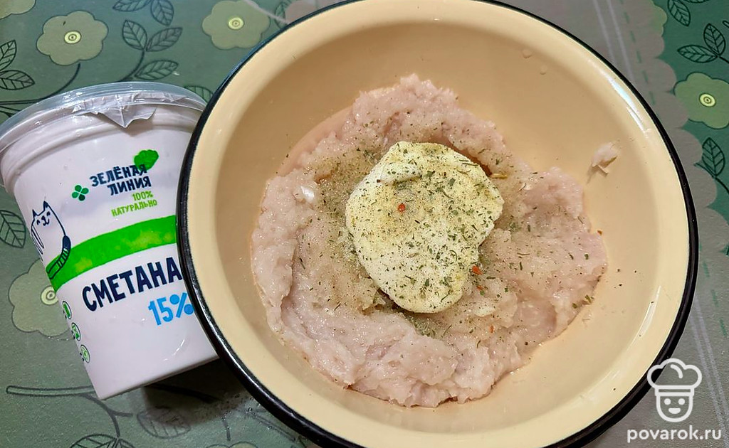 К фаршу добавляем соль и сметану. Я выбрала сметану 15% жирности. Она добавит нежности и сочности.