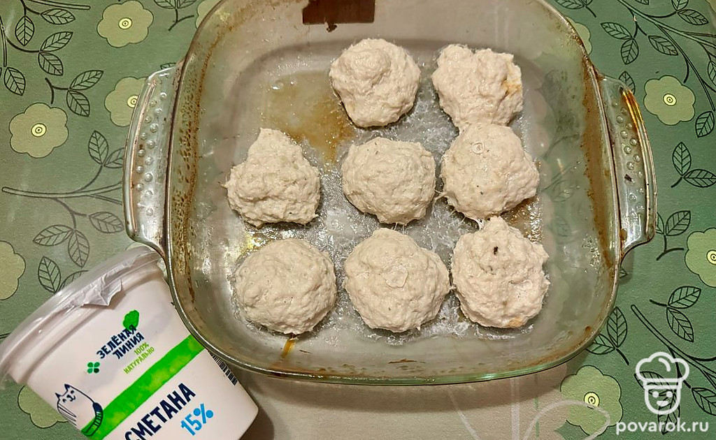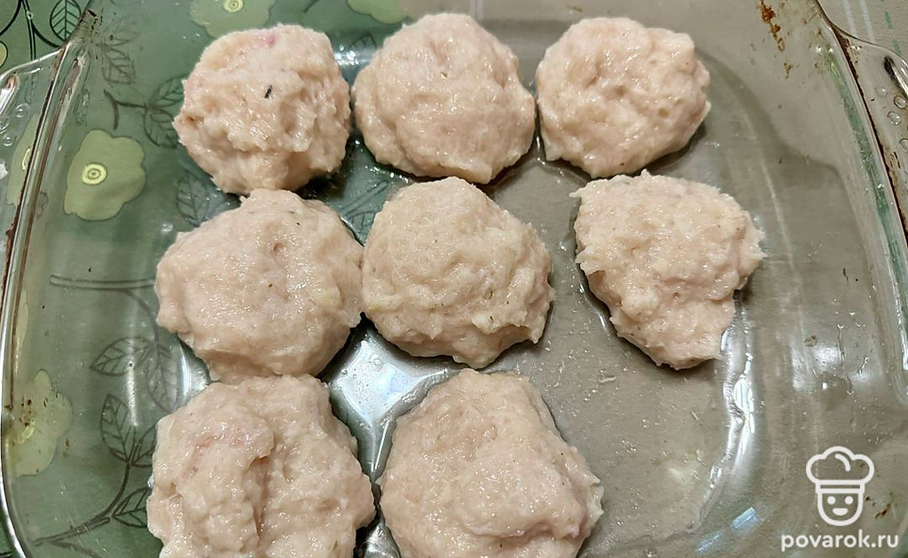 Перемешиваем фарш и влажными руками формируем колобки. Выкладываем в форму, накрываем фольгой. Ставим в нагретую духовку и запекаем минут 30.