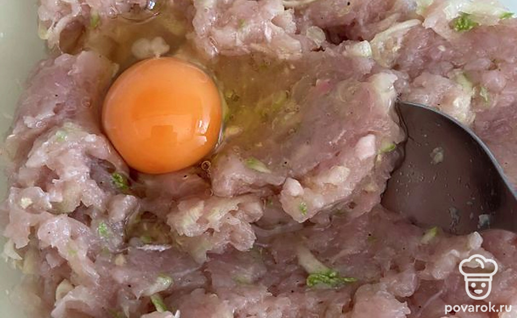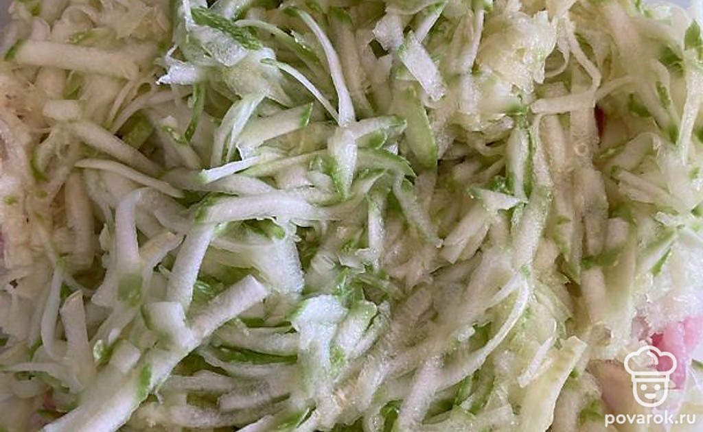 Натрите на средней терке кабачок, добавьте к фаршу.