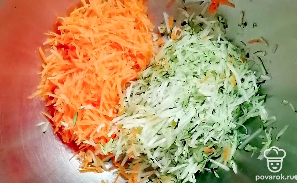 Натрите на мелкой терке морковь и половину цукини.