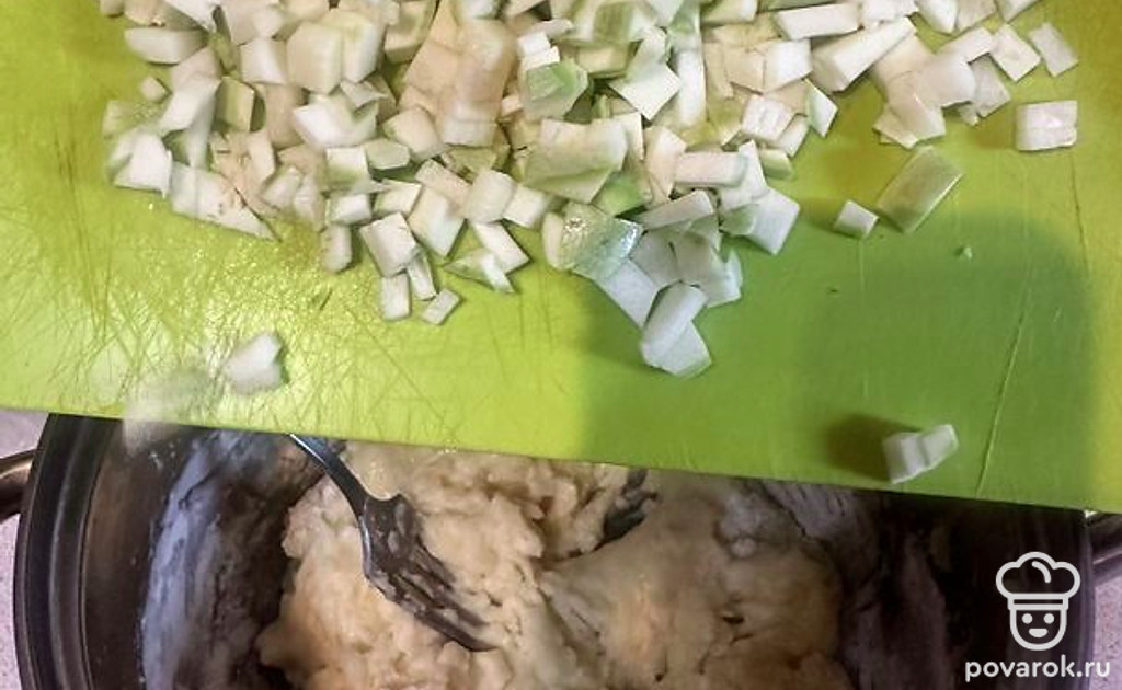 Кабачок нарезаем мелкими кубиками и соединяем с ингредиентами.
