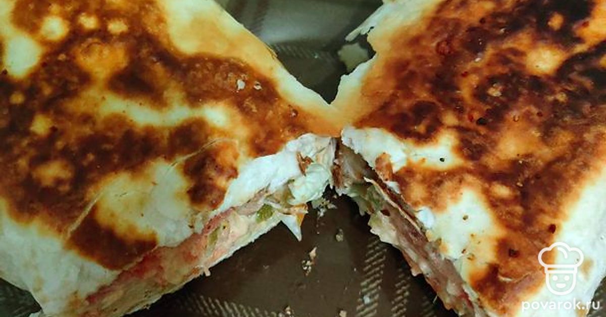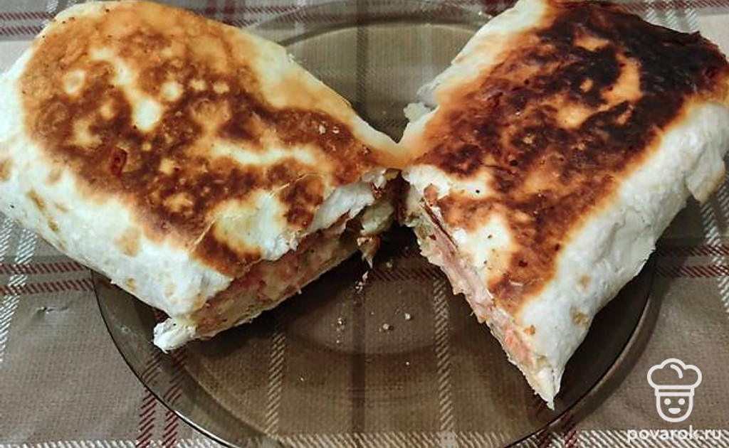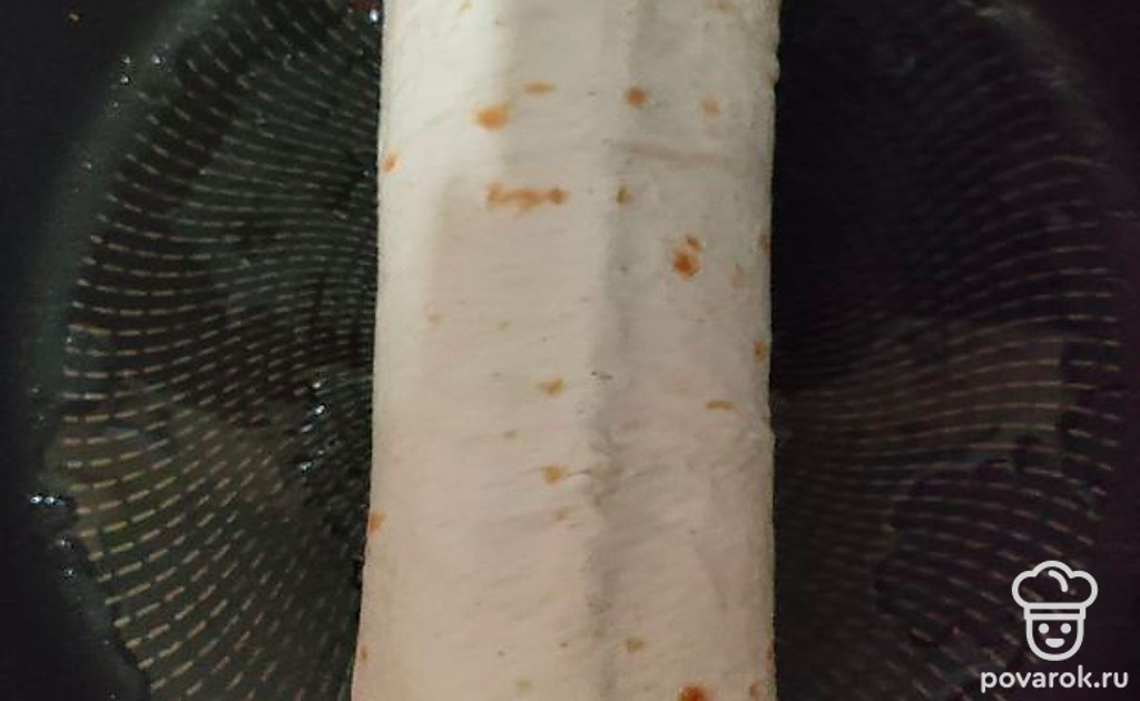 Завернуть шаурму и обжарить на сковороде с обеих сторон до румяной корочки.