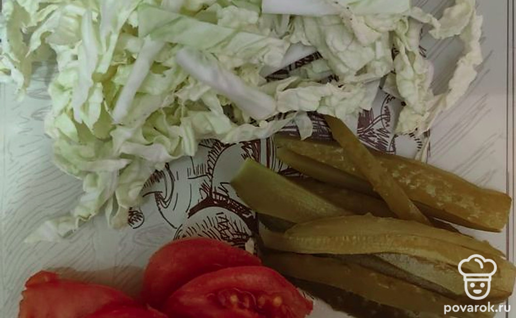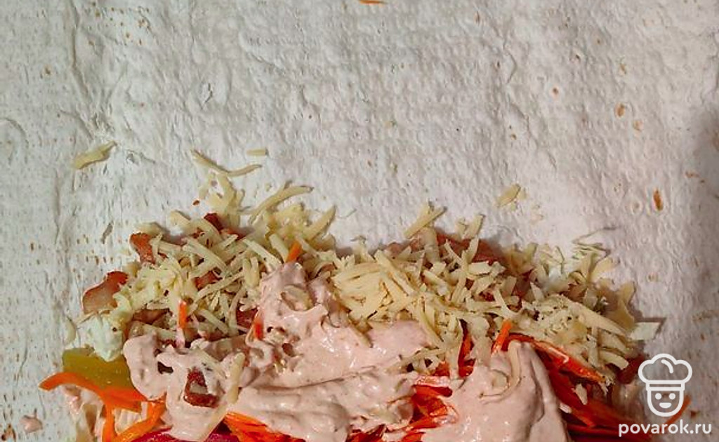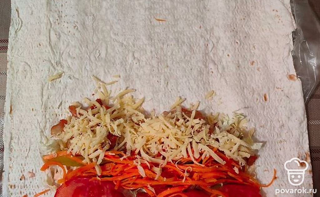 Разложить лаваш и выложить в крайнюю часть овощи и курицу, добавить корейскую морковь и тертый сыр.