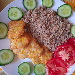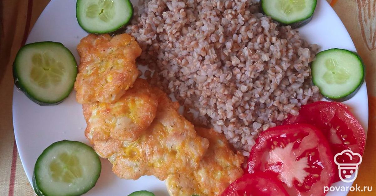 Гречку промойте, залейте водой. Посолите и варите 20 минут. Выложите гречку на тарелку и выложите к ней куриные рубленые котлеты.