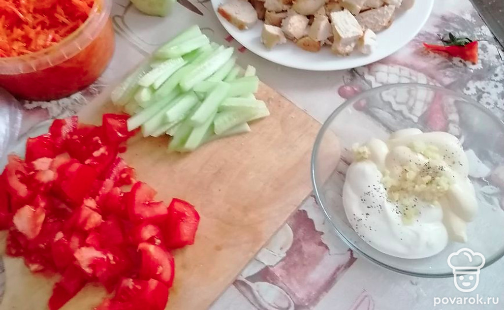 Курицу жарим на сковороде до готовности Огурцы и помидоры режем тонкими полосками. Делаем соус из майонеза и сметаны с добавлением чеснока. Можно добавить лук красный или капусту.