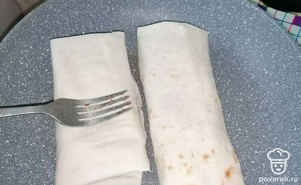 Лаваш смазываем готовым соусом и добавляем готовые ингредиенты. Заворачиваем и греем на сковороде.