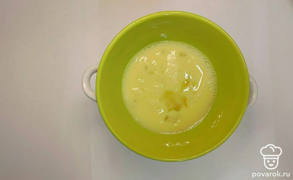 Для приготовления теста взбейте яйцо со щепоткой соли в миске. Используйте для этого миксер, тогда тесто получится более однородным, без комочков и нежным.