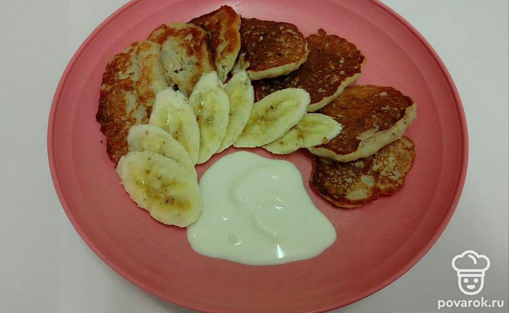 Подавайте оладьи со сметаной и нарезанным кружочками бананам.