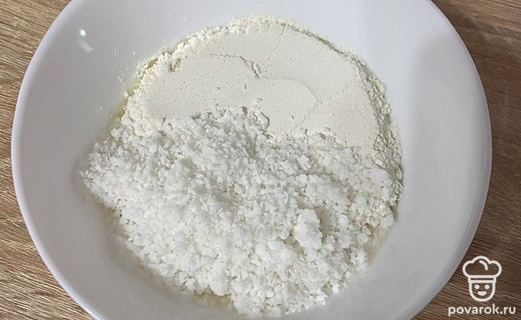 Смешайте сухие ингредиенты: смесь мучную, стружку, соль/сахар.
