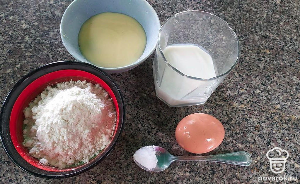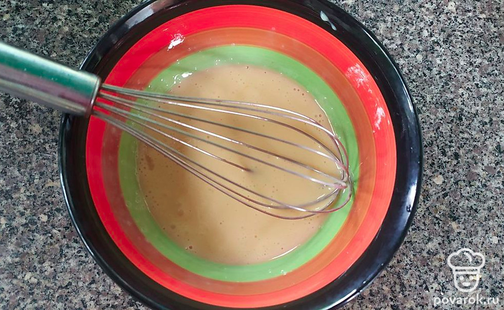 Взбейте сгущенку с яйцом до однородности. Добавьте молоко, тщательно перемешайте. Постепенно всыпайте муку, добавьте разрыхлитель. Перемешайте еще раз.