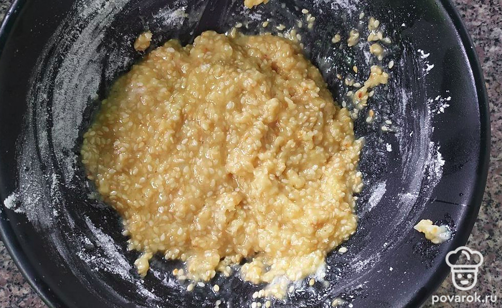 Сливочное масло разотрите с сахаром. Добавьте яйцо, кунжут, муку и разрыхлитель. Все тщательно перемешайте. Количество муки можно регулировать, тесто по консистенции должно получиться похожим на густую сметану.