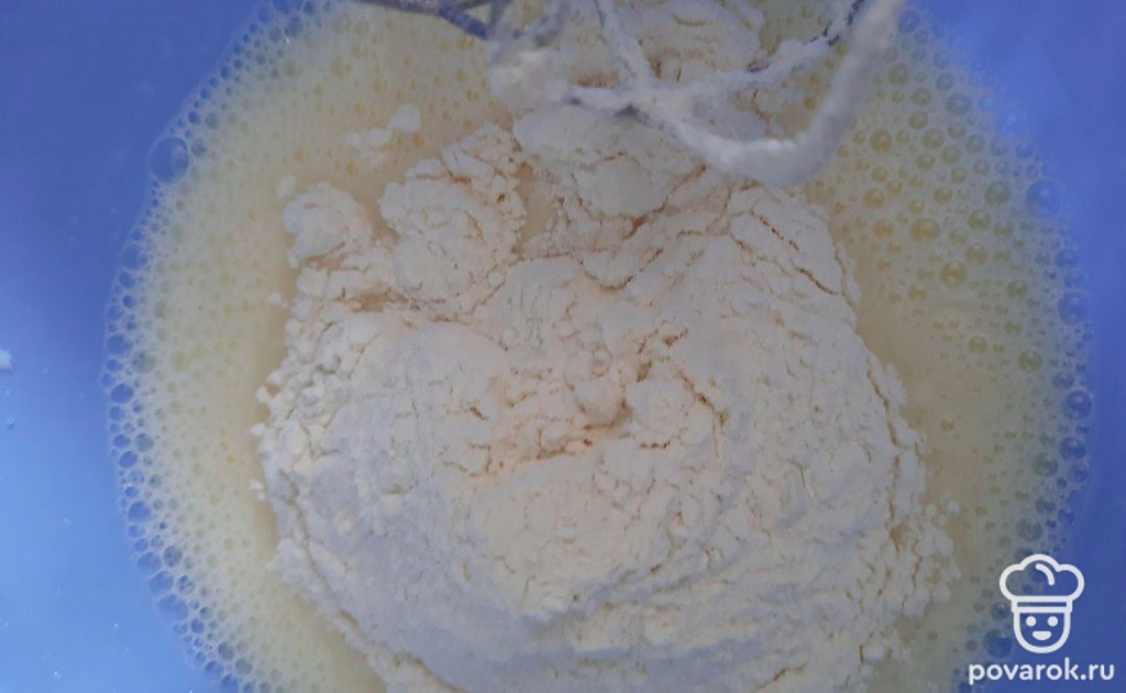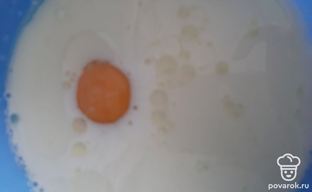 В молоко разбейте яйцо, добавьте соль, сахар и подсолнечное масло. Взбейте.