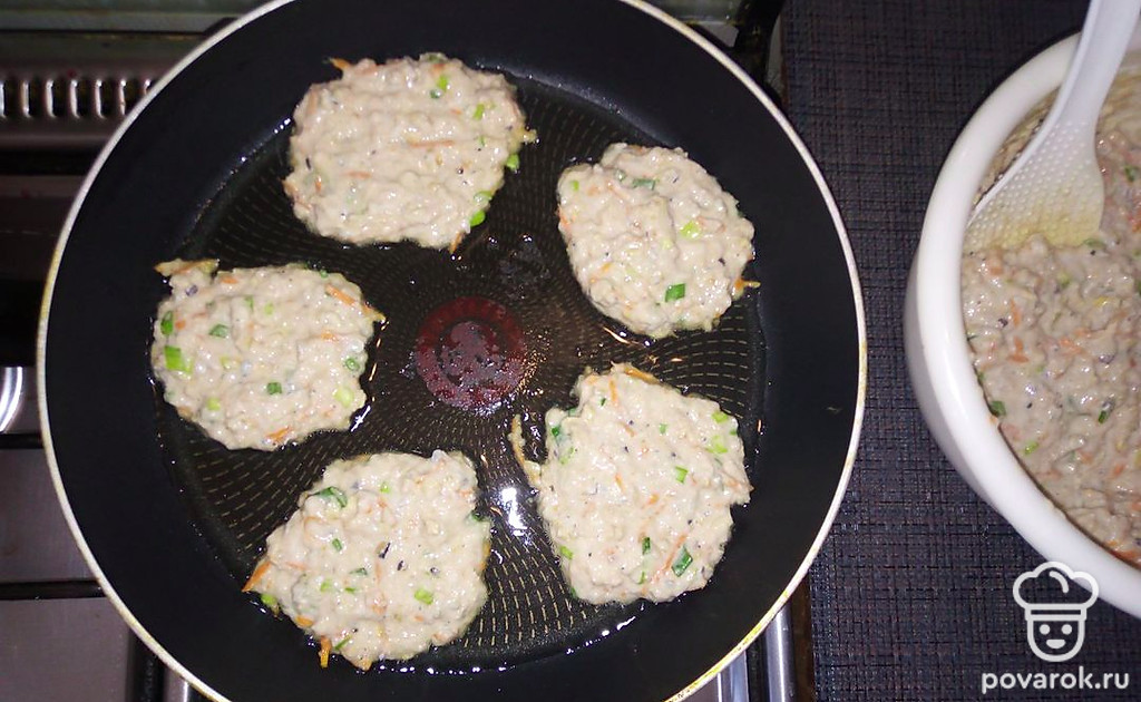 Если у вас есть домочадцы, которые воротят нос от рыбных котлет, то приготовьте для них рыбные оладьи. Это настоящий лайфхак. В поджаренных тонких лепешках с зеленым луком и овсянкой вкус рыбы сильно притупляется. Гарантирую, что этот рецепт станет вашей палочкой-выручалочкой, особенно в составлении детского меню.