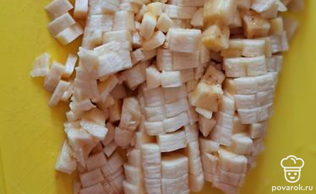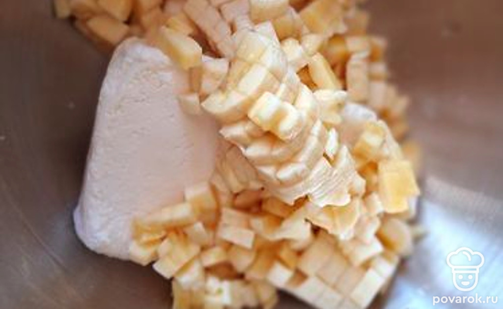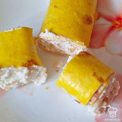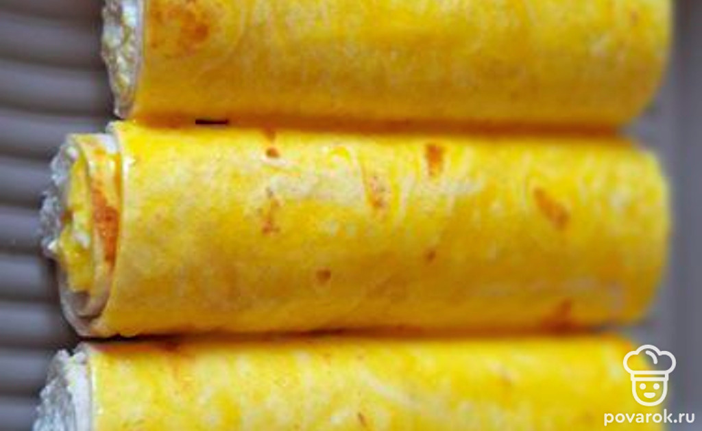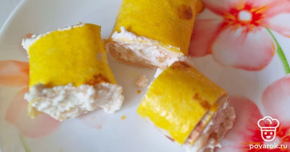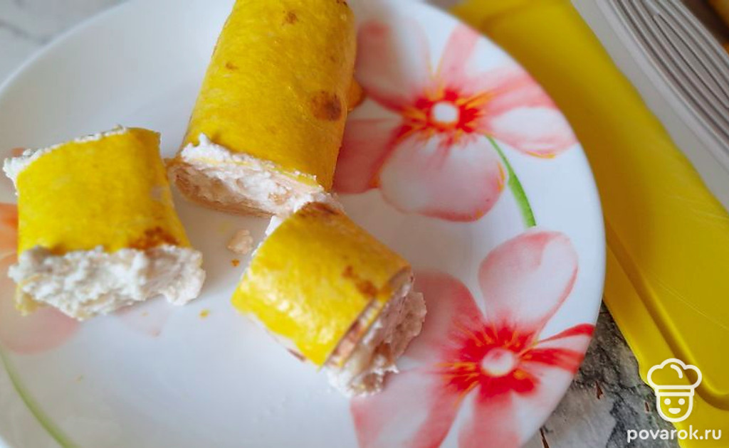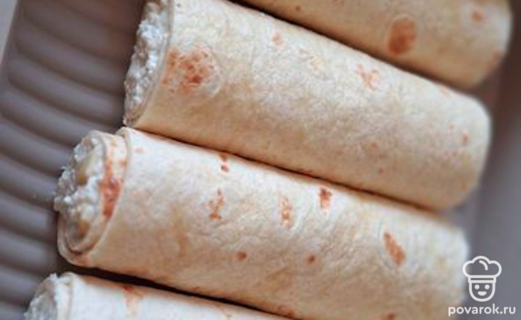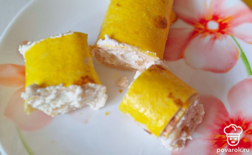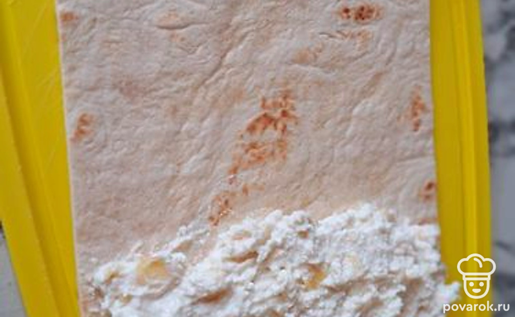 Лаваш или лепешку нарежьте полосками любых размеров, чтобы завернуть начинку. Выложите творожно-банановую смесь на полоски.