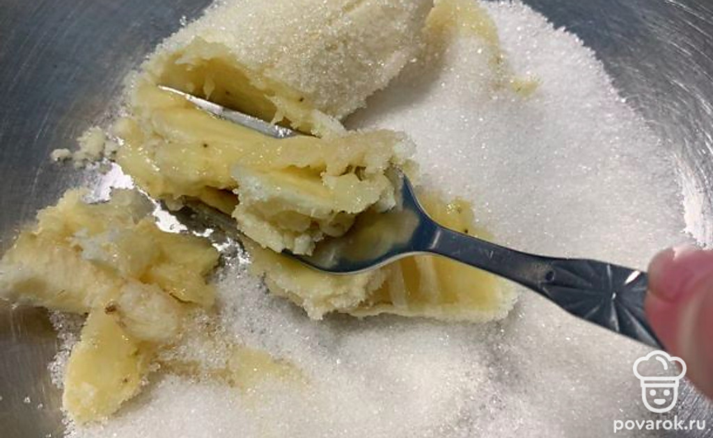 Банан очистить от кожуры и помять с сахаром.