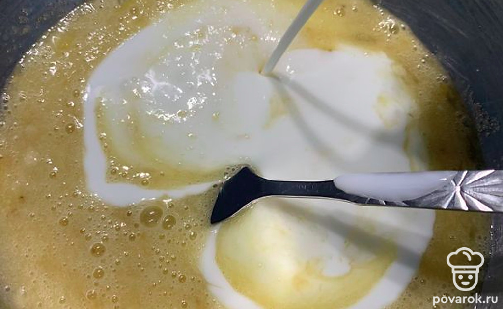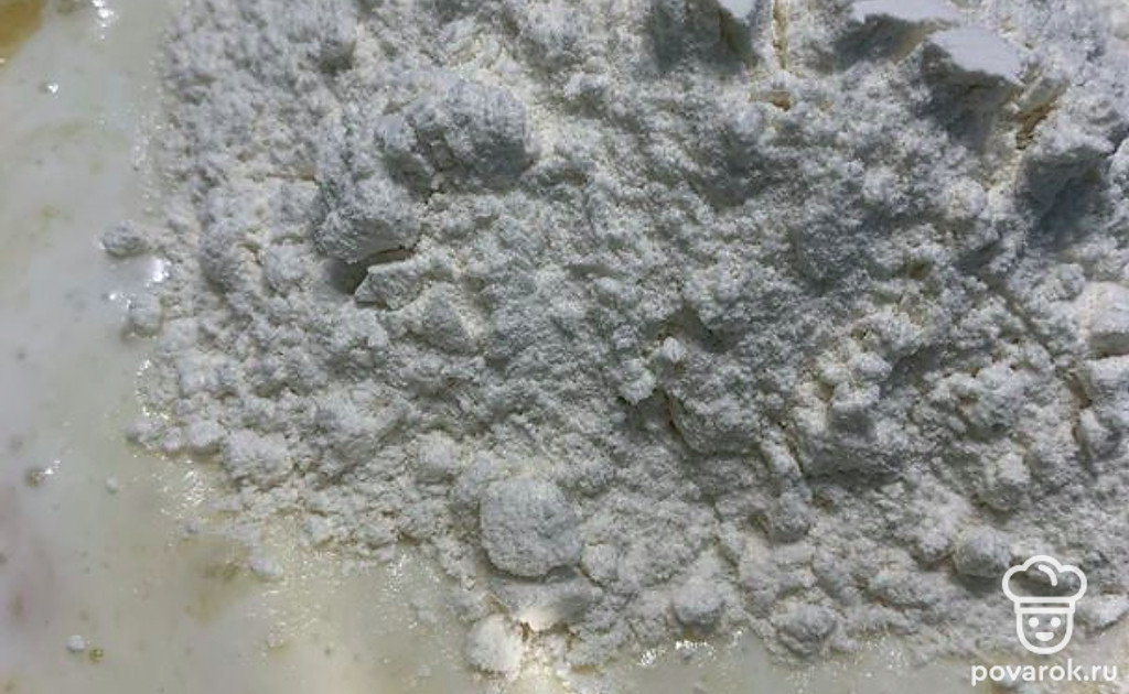 Добавляем муку и тщательно перемешиваем.