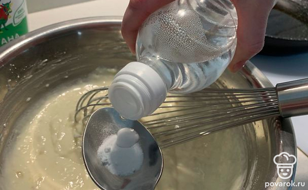 Гасим соду уксусом и добавляем в миску.