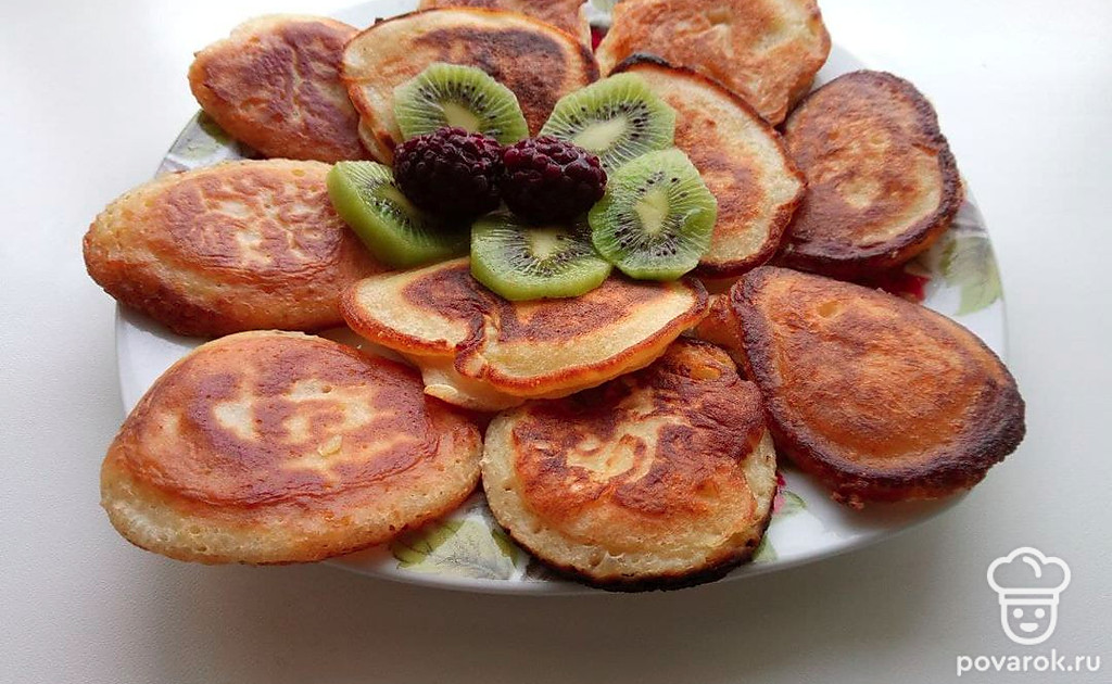 Готовые оладьи переложите в блюдо и украсьте фруктами.