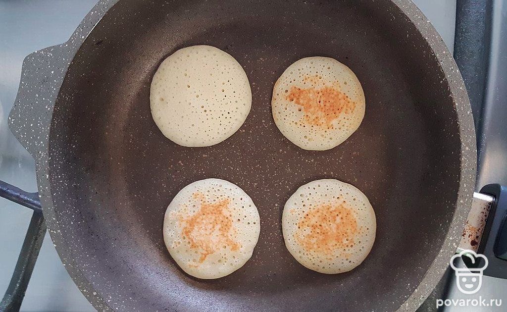 Жарить оладушки на сухой сковороде на среднем огне по 3-4 минуты с каждой стороны.