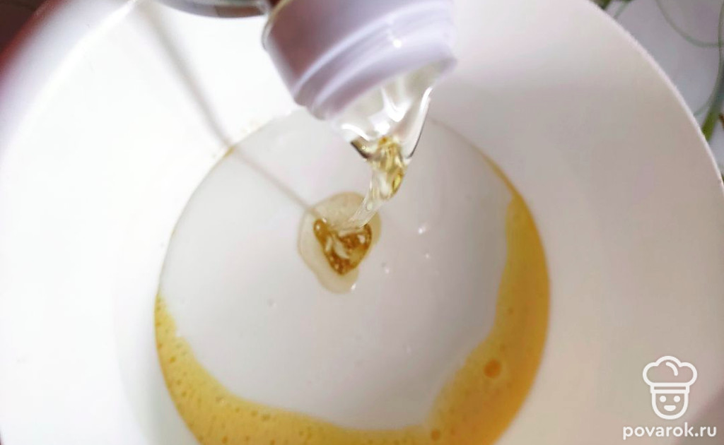 Добавить кефир, пару столовых ложек подсолнечного масла, перемешать.