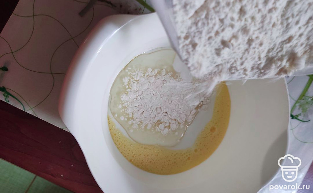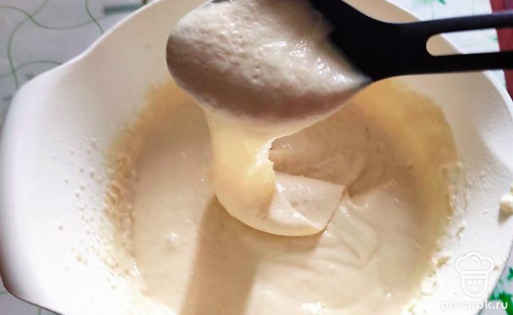 Постепенно ввести муку. Размешивать, добавляя муку так, чтобы получилась консистенция сметаны. Вместе с мукой ввести соду. Не гасить.