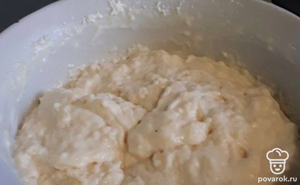 Добавить муку, перемешать, оставить на 10 минут. После этого не перемешивать.