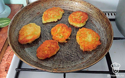 Нагреть сковороду, налить масло и выложить тесто в виде оладьев.