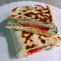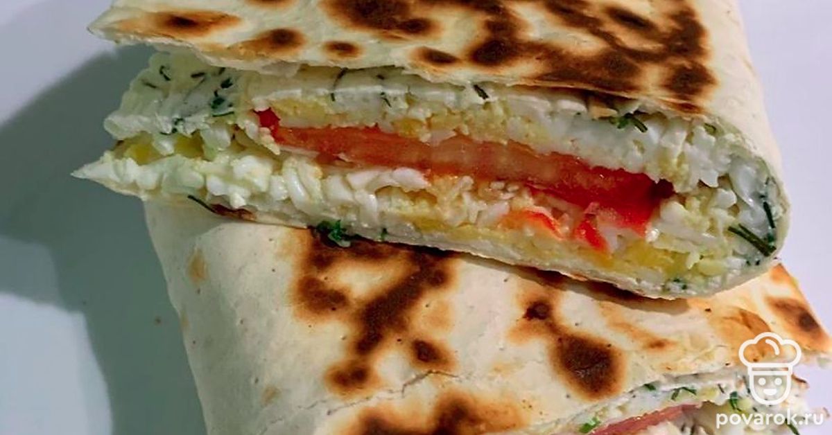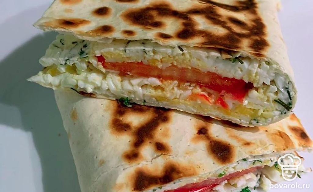 Включите греться сковороду без масла. Тонким слоем нанесите творожную массу на лаваш и посыпьте яйцом. Выложите ломтики помидора. Скрученный белковой ролл прогрейте на сковороде с двух сторон по 2 минуты.