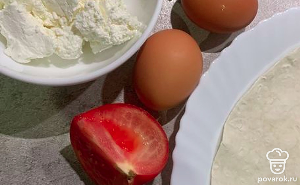 Сварите яйца. Придайте круглую форму лавашу, если у вас он не круглый. Сметану можете заменить йогуртом. Нарежьте зелень, разомните вилочкой творог. 1/4 помидора нарежьте пластинками.