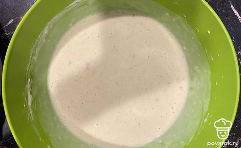 Добавит кефир и муку. Перемешать.