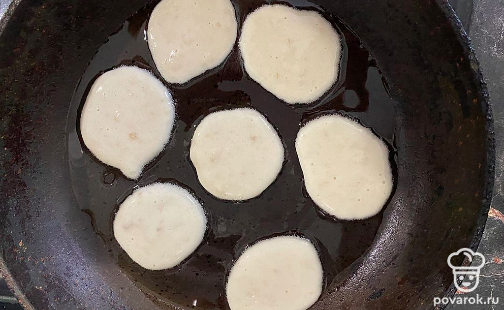 Ложкой наложить в сковороду оладушки и жарить до золотистого цвета с двух сторон.