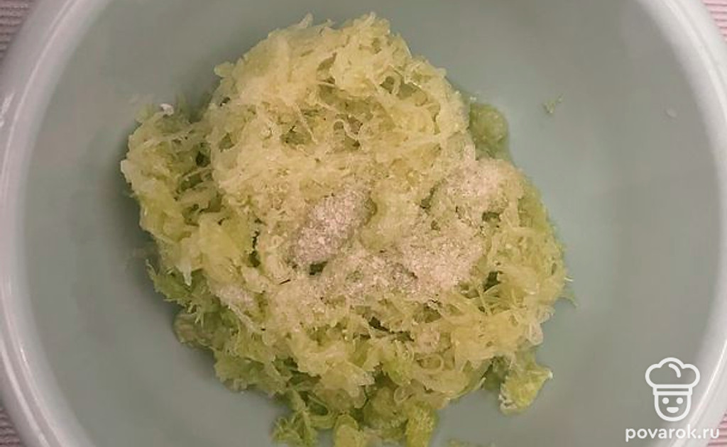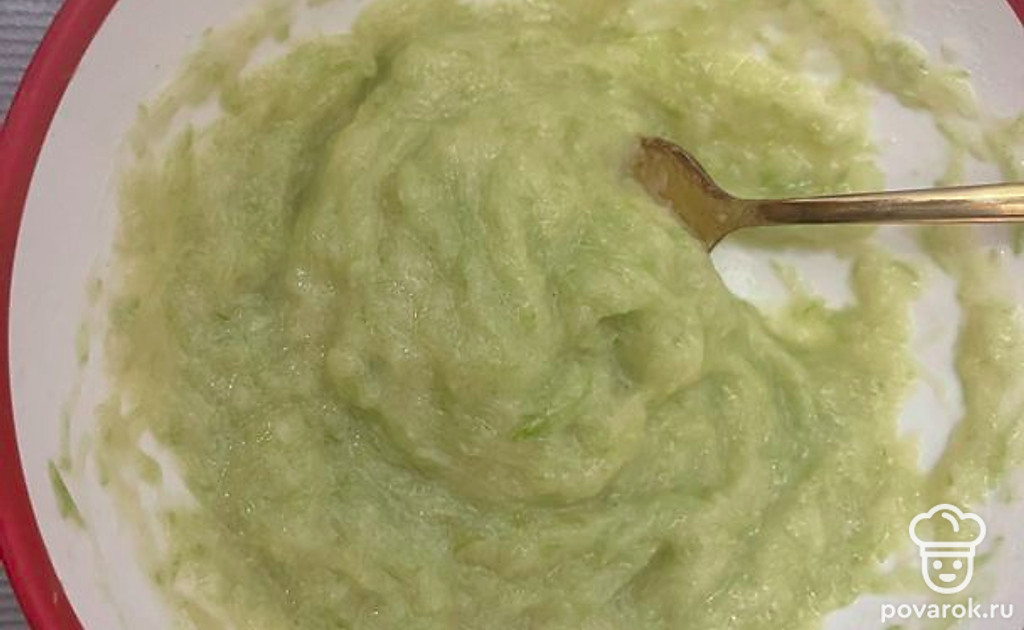 Кабачок помыть и натереть на мелкой терке, посолить и оставить минут на 20 чтобы выделился сок.