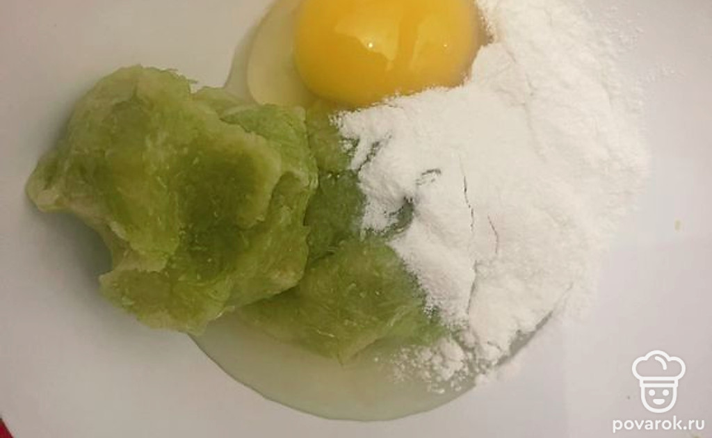 Кабачок отжать хорошо от лишней жидкости, добавить одно яйцо и рисовую муку. Можете заменить пшеничной мукой.