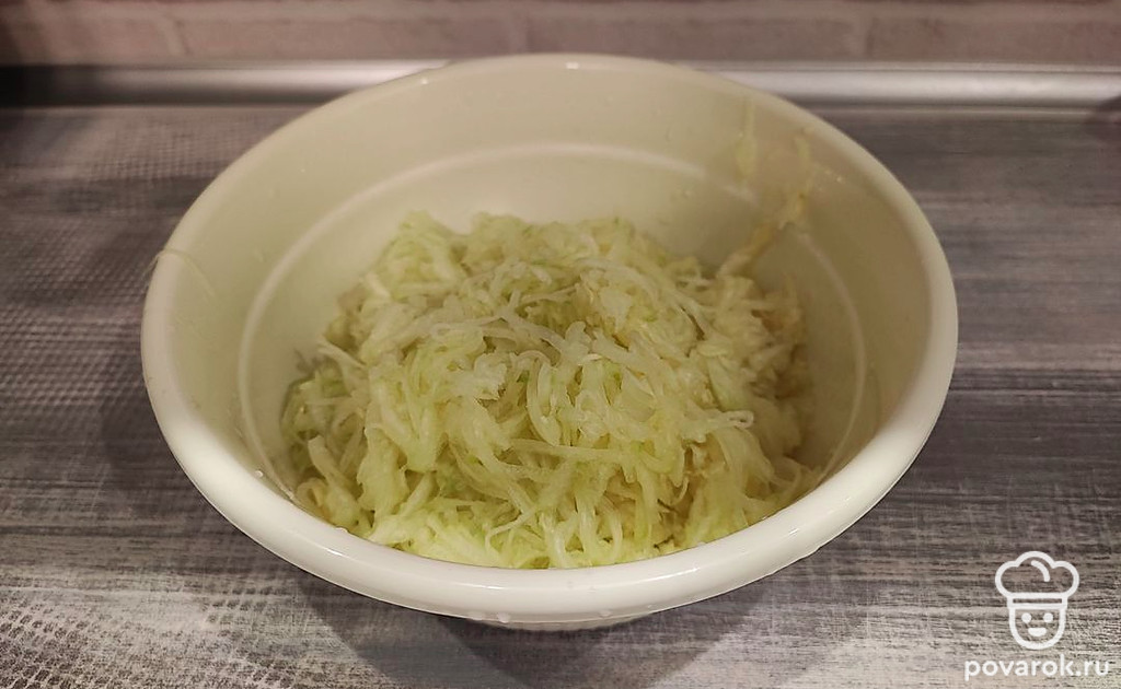 Натереть кабачок на крупной терке.