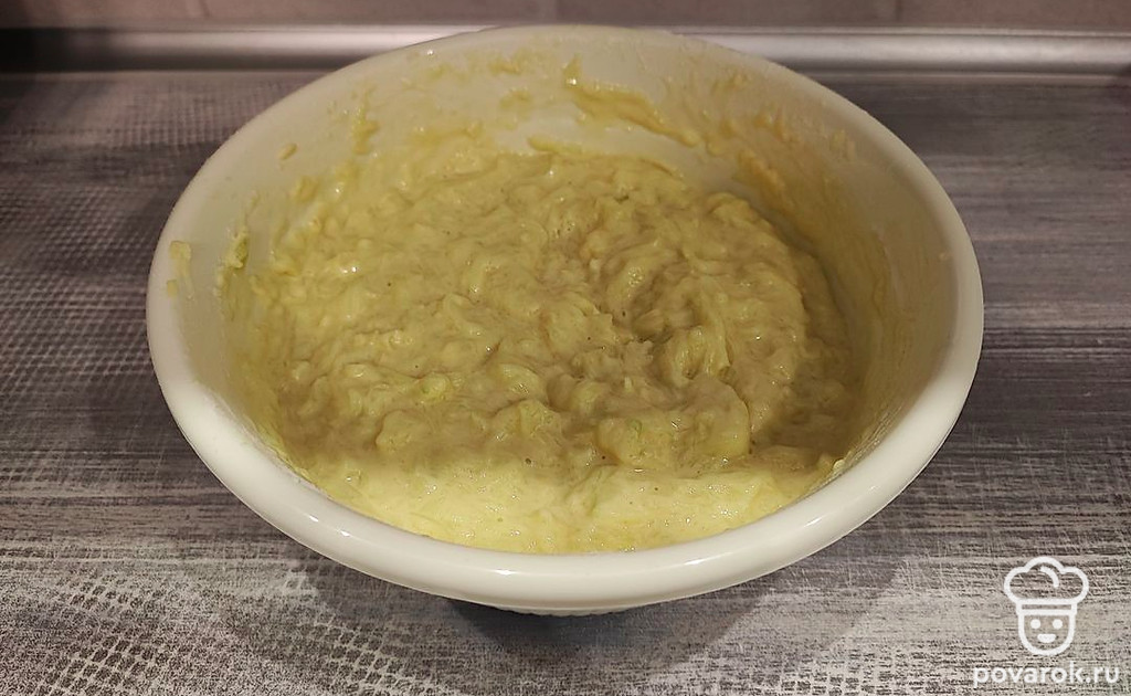 Смешать натертый кабачок с яйцами и мукой.