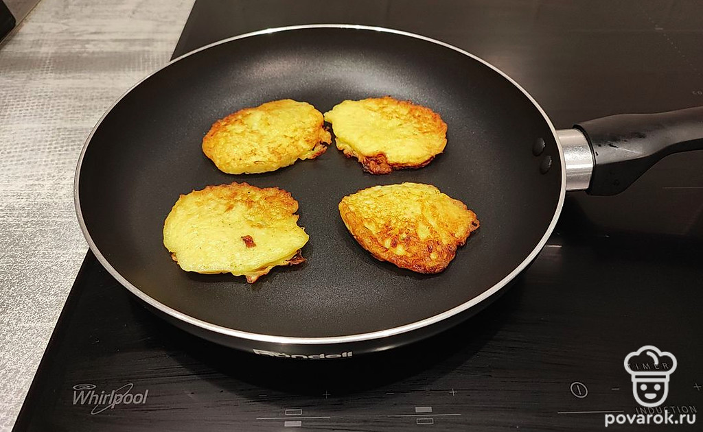 Жарить на подсолнечном масле, выкладывая форму оладушек.
