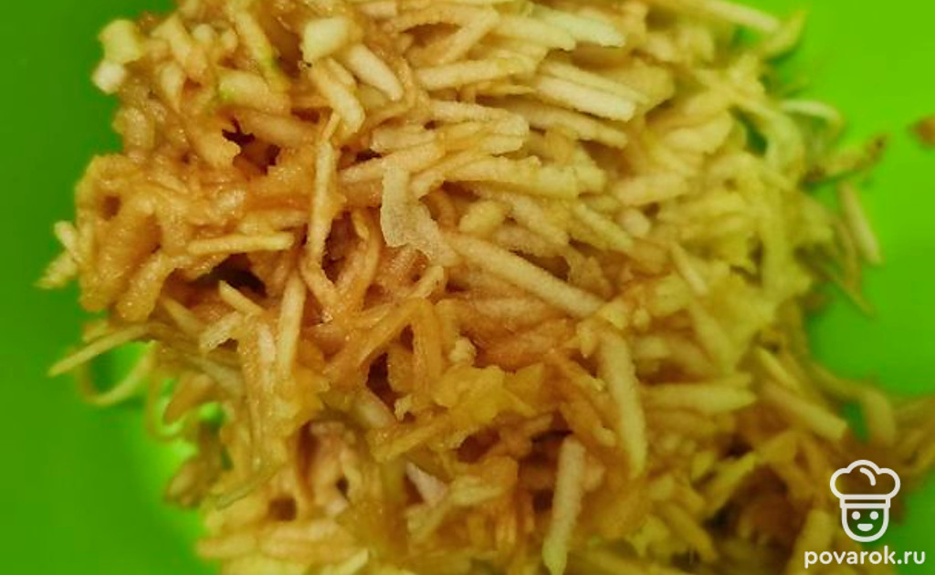 Очистеть яблоки от кожуры и натереть их на крупной терке.