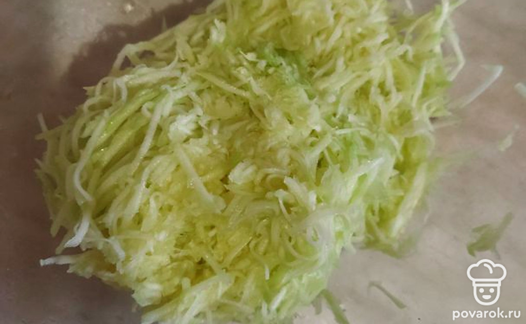 Натрите кабачок на треке, посолите и выложите на дуршлаг. Оставьте минут на 10, чтобы стек лишний сок.