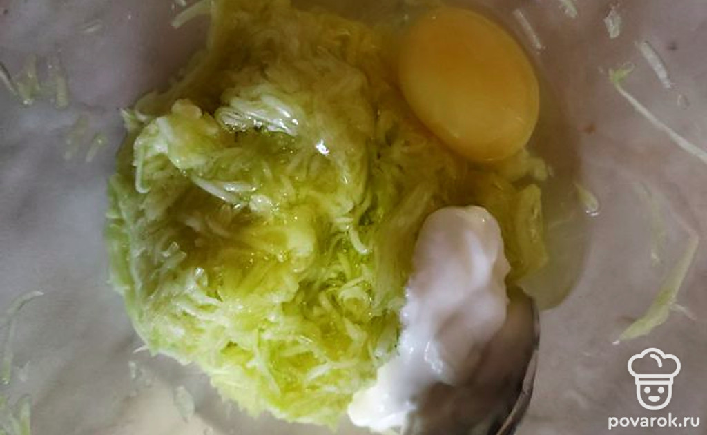 Добавьте к кабачкам сметану, яйцо, разрыхлитель и муку, перемешайте.