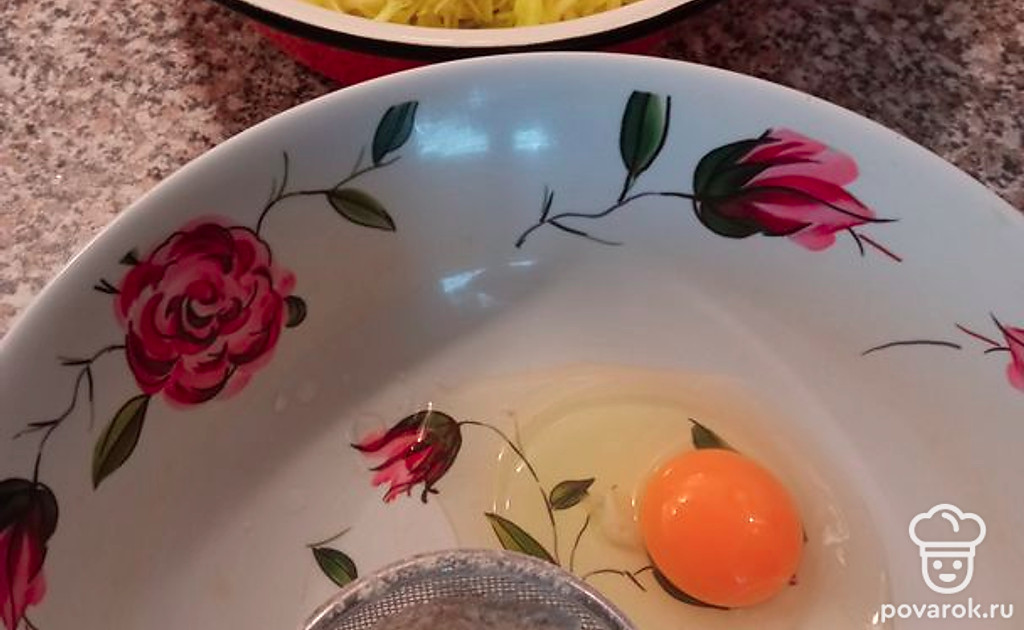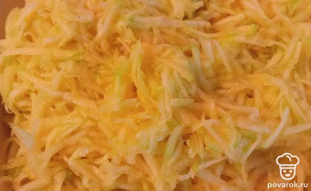 Кабачок вымыть, очистить и натереть на тёрке. До подачи на стол нельзя солить и добавлять приправу, иначе кабачки дадут сок!