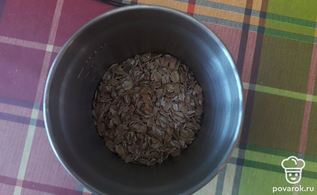Овсяные хлопья помещаем в мельницу. Если нет мельницы для хлопьев, то можно воспользоваться блендером или простой кофемолкой.