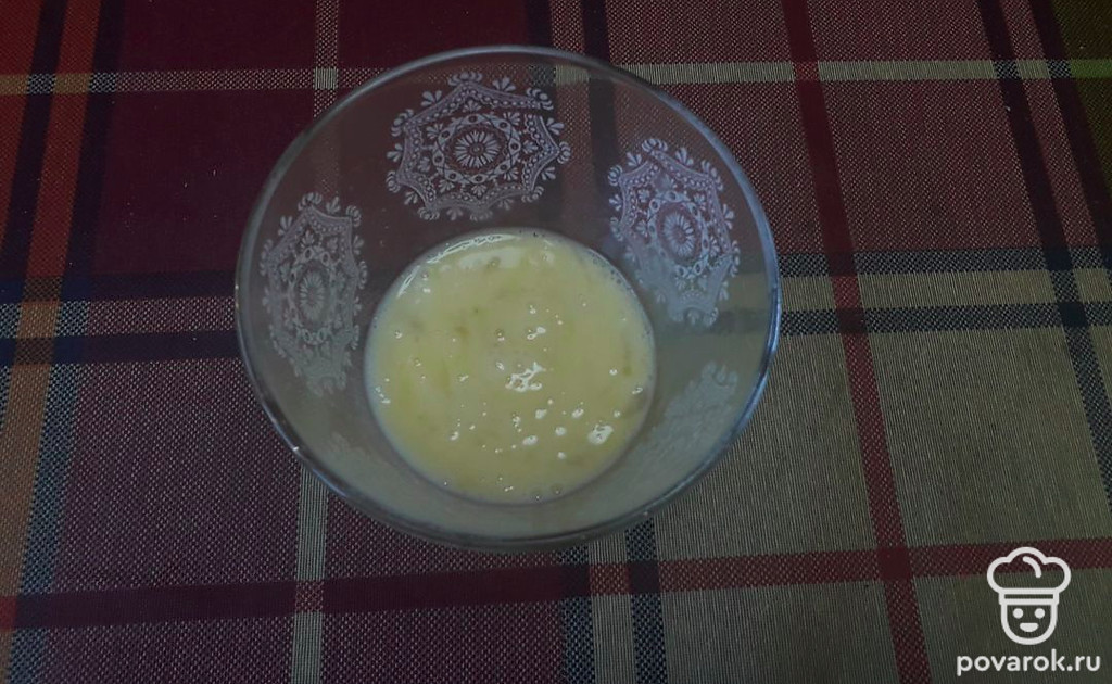 В другую ёмкость помещаем нарезанный на небольшие кусочки банан и разминаем его вилкой до консистенции пюре. Смешиваем все ингредиенты.