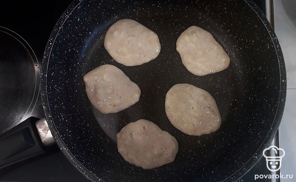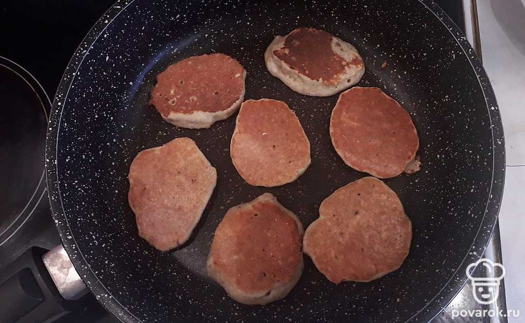 На разогретой на среднем огне сковороде без масла (или с его небольшим количеством) ложкой формируем ПП-оладьи, жарим по 3-4 минуты с каждой стороны.
