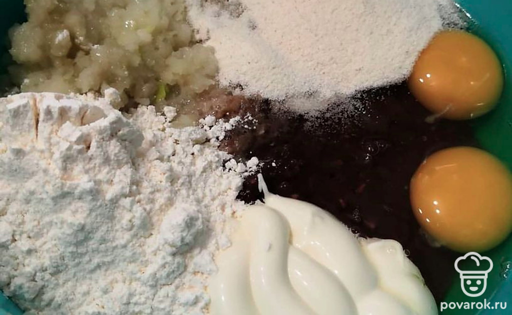 Добавляем яйца, сметану, муку, манную крупу и смешиваем, солим и перчим по вкусу.