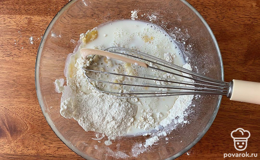 Добавьте половину муки и молока, перемешайте, затем добавьте остальную муку и молоко, снова перемешайте.