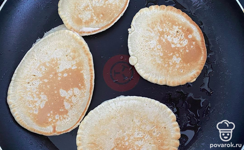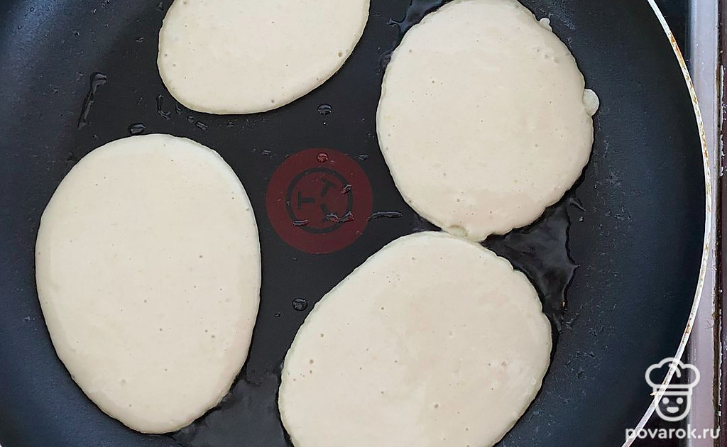 Вылейте тесто, следите, чтобы оладушки не подгорели.