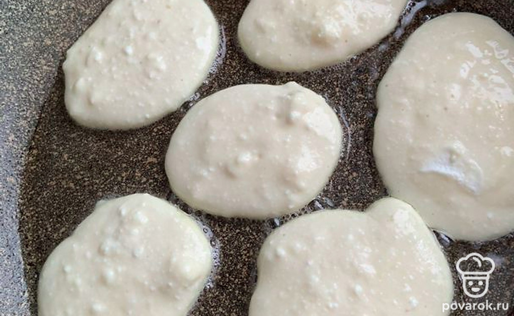 Выложить на разогретую сковороду и обжарить оладушки с обеих сторон, по 4 минуты с каждой.