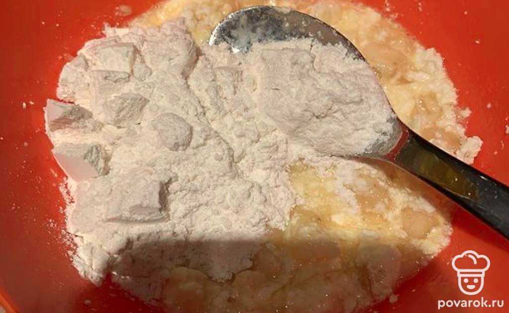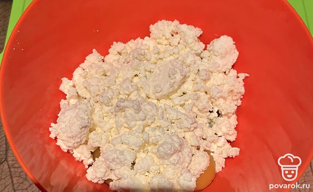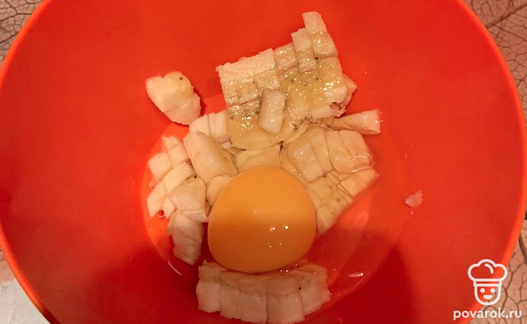 Банан измельчить и переложить с ёмкость, добавить яйцо.