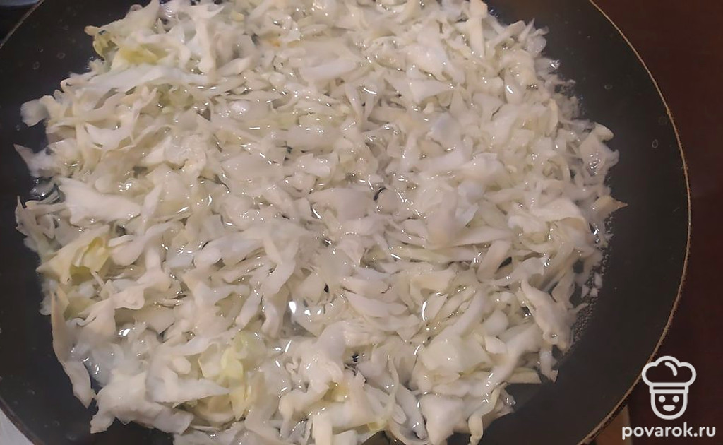 Капусту белокочанную шинкуем, желательно мелко. Выкладываем в кастрюльку или сковородку и заливаем полностью водой. Отвариваем до готовности