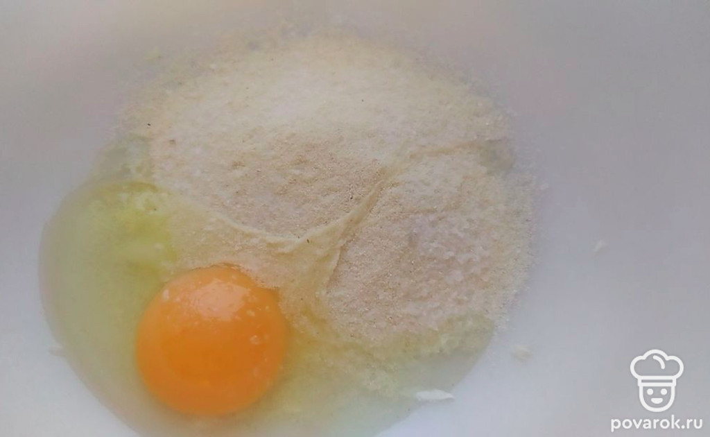 В глубокую чашу насыпаем 4 столовые ложки манной крупы, добавляем 1 яйцо и соль по вкусу.